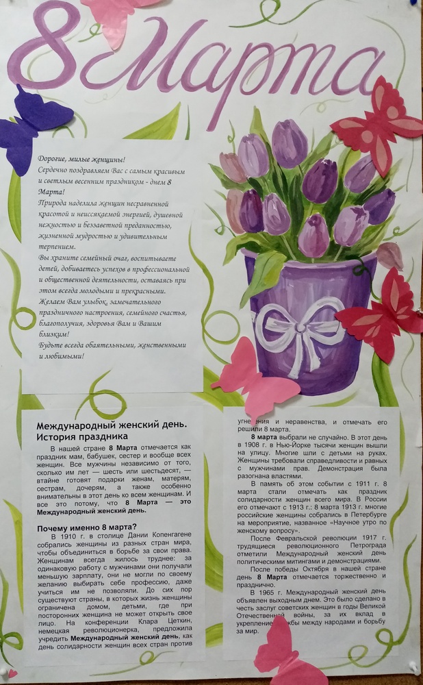 Вместе с весной к нам приходит самый прекрасный и замечательный праздник – Международный женский день 8 марта. Этот день особенный, он согрет лучами солнца и женскими улыбками, украшен россыпью цветов, нежностью.