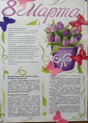 Вместе с весной к нам пришел прекрасный и замечательный праздник – Международный женский День 8 марта. 8 Марта - самый удивительный, самый нежный праздник весны! Этот день особенный, он согрет лучами солнца, женскими улыбками, украшен россыпью цветов, нежностью.